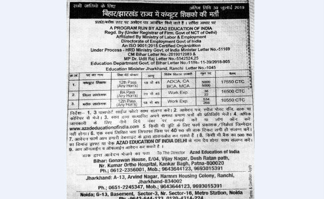 आजाद एजुकेशन अॉफ इंडिया नामक संस्था ने झारखंड और बिहार के समाचार पत्रों में 10862 पदों पर नियुक्ति के लिए विज्ञापन प्रकाशित कराया है.