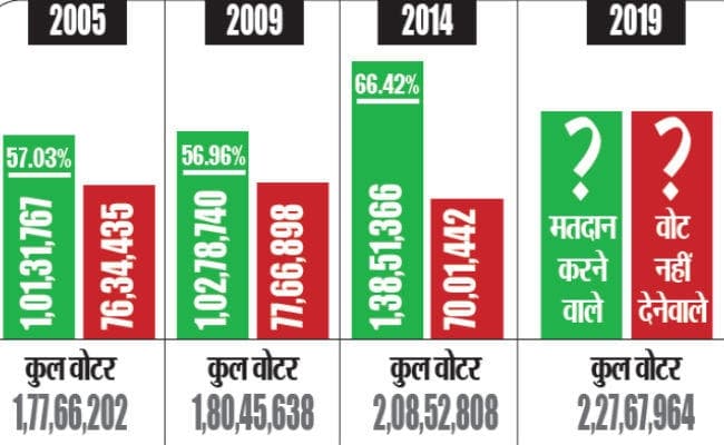 इसकी तुलना राज्य की करीब 3.29 करोड़ की आबादी से करें, तो अब तक के हर चुनाव में करीब एक चौथाई लोगों की ही सरकार बनाने में भूमिका रही थी. वर्ष 2005 में कुल वोटर करीब 1.78 करोड़ थे. वर्ष 2009 में 1.80 करोड़ तथा 2014 के विधानसभा चुनाव में वोटरों की कुल संख्या बढ़ कर 2.08 करोड़ थी. दरअसल राज्य में हुए पहले विधानसभा चुनाव (2005) की तुलना में अभी 2019 में वोटरों की संख्या करीब 50 लाख बढ़ी है. बढ़ती आबादी के अनुपात में मतदान का रुझान नहीं बढ़ रहा. अब तो वोटरों के पास नोटा का विकल्प भी है.