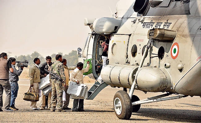 हेलीड्राॅपिंग के जरिये दुर्गम इलाकों में पहुंचाया जा रहा मतदानकर्मियों को