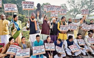 नयी दिल्ली : चाईबासा में पत्थलगड़ी मामले में आदिवासियों की हुई हत्या के विरोध में बुधवार को संसद भवन में महात्मा गांधी की प्रतिमा के सामने भाजपा के सभी अनुसूचित जनजाति के सांसद व राज्यसभा के भाजपा सांसदों ने गांधी प्रतिमा के सामने धरना दिया. गुदड़ी (झारखंड) में आदिवासियों का नरसंहार हाय-हाय कांग्रेस-जेएमएम सरकार, आदिवासियों की हत्यारी-राहुल-हेमंत सरकार जैसे नारे लिखे तख्तियां लिये सभी सांसद हत्याकांड की जांच केंद्रीय एजेंसी से कराने की मांग कर रहे थे.