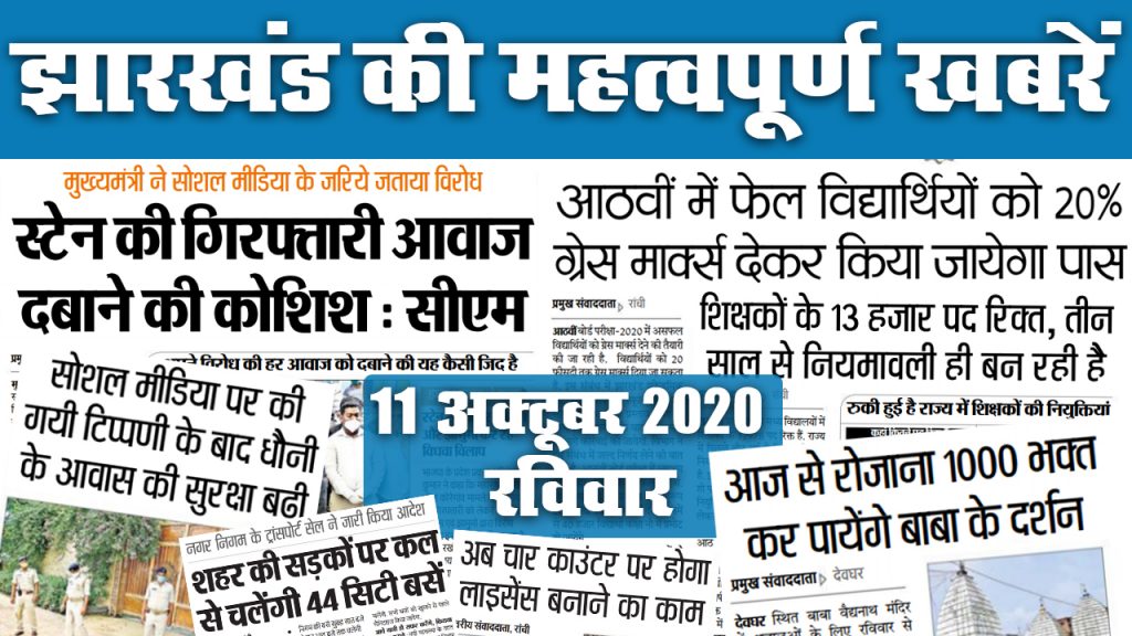 Jharkhand News, Navratri 2020, Irctc News, Ranchi, Deoghar, Jamshedpur, Dhanbad : आज से राज्य भर में ड्राइविंग लाइसेंस बनने का काम शुरू हो जायेगा. इधर, सरकार ने आधा दर्जन परीक्षाओं का रास्ता साफ कर दिया है. दुर्गा पूजा के बाद जायेंगी संपूरक और लंबित परीक्षाएं. धौनी को धमकी देने वाले ने कहा कि मैं बचपन से उन्हीं का फैन हूं, प्रदर्शन खराब से नाराज था. इसके अलावा रेलवे, कोरोना, नवरात्री, झारखंड उपचुनाव की महत्वपूर्ण खबरों को देखने के लिए बने रहें हमारे साथ..