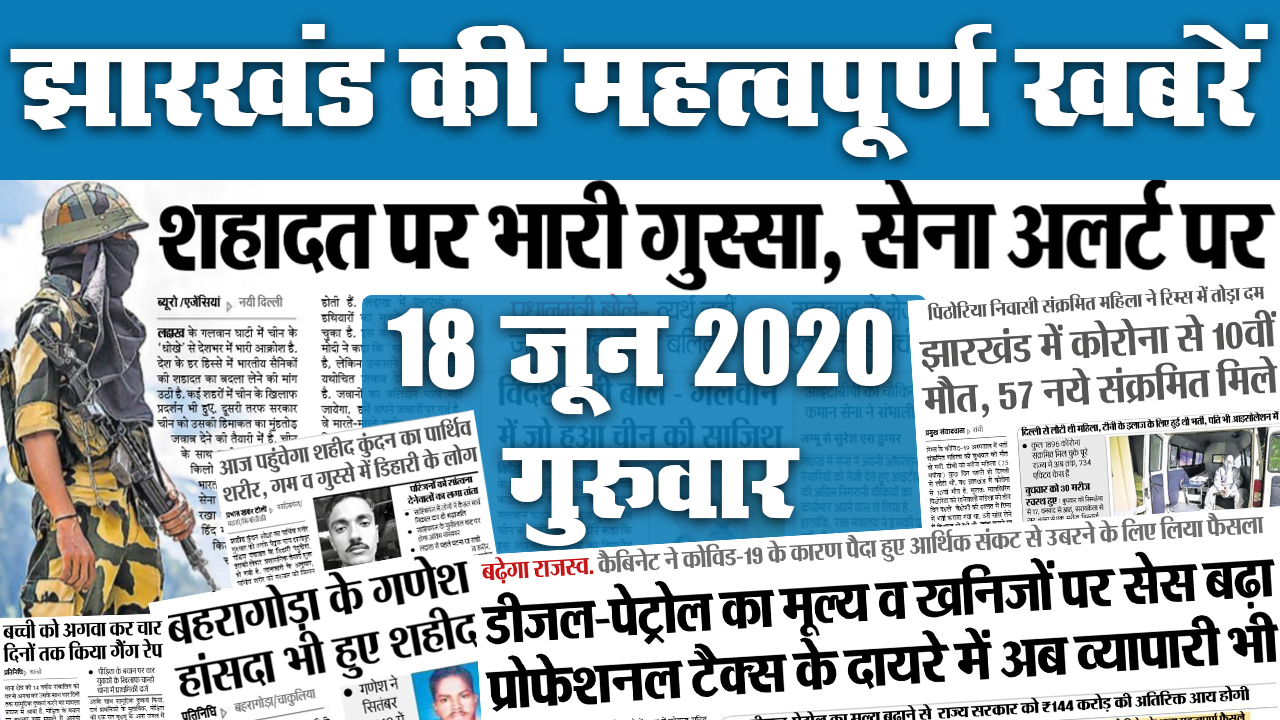 Jharkhand News, Galwan Valley, 18 June 2020 Coronavirus Latest Updates, Lockdown Relaxation, Lockdown 5.0 latest news, Unlock 1.0 News, watch 20 Important news of Jharkhand, Ranchi Simdega Hindpiri Bero Garhwa Jamshedpur Dhanbad deograh Bokaro झारखंड के चार प्रमुख शहर रांची, जमशेदपुर, धनबाद और देवघर के आसपास की महत्वपूर्ण खबरें रोज सुबह यहां देखें.