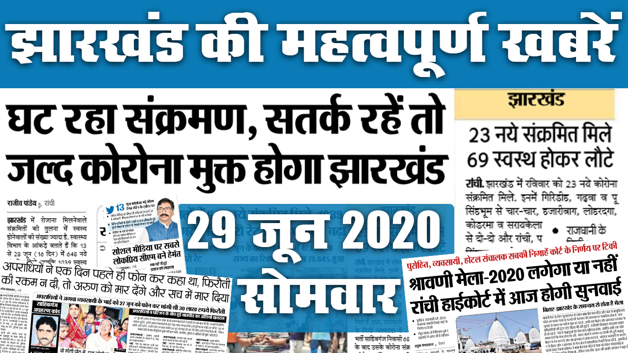 Jharkhand News, 29 June 2020, Coronavirus Latest Updates, Lockdown Relaxation in jharkhand, Unlock 1, watch 20 Important jharkhand news today, Ranchi Simdega Hindpiri Bero Garhwa Jamshedpur Dhanbad deograh Bokaro, shravani mela 2020 : झारखंड के चार प्रमुख शहर रांची, जमशेदपुर, धनबाद और देवघर के आसपास की महत्वपूर्ण खबरें रोज सुबह यहां देखें.