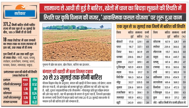 गौरतलब है कि इस वर्ष राज्य सरकार ने 18 लाख हेक्टेयर में धान लगाने का लक्ष्य रखा था. इसमें अब तक मात्र 1.02 लाख हेक्टेयर में ही धान लग सका है. इसमें कुछ जिलों में छींटा विधि से धान लगाया गया है. बारिश नहीं होने के कारण किसानों का बिचड़ा खेतों में ही सूखने की स्थिति में है. हालांकि, कृषि विभाग पूरी स्थिति पर नजर रखे हुए है. विभाग ने ‘आकस्मिक फसल योजना’ पर काम शुरू कर दिया है. विभाग मानता है कि अभी देर नहीं हुई है. यहां के किसान अगस्त तक खेतों में धान लगाते हैं. विभाग ने किसानों तक धान पहुंचा दिया है.आधे से भी कम बारिश हुई है अब तक राज्य में