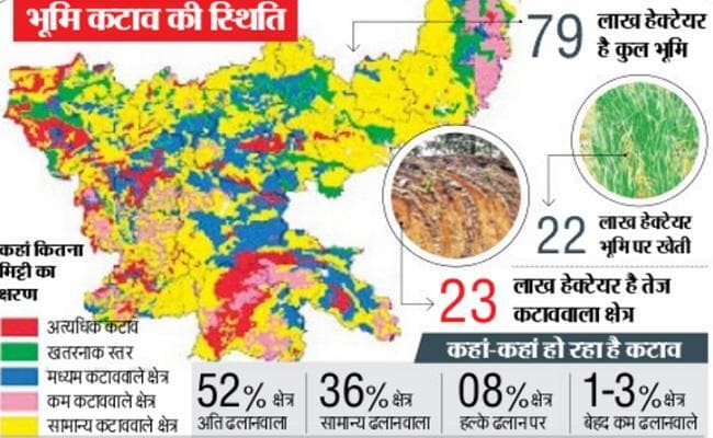 रिपोर्ट बताती है कि पलामू के कुल भू-भाग 8,02,291 हेक्टेयर में से 50,363 हेक्टेयर भूमि कटाव के दायरे में है. प सिंहभूम, पू सिंहभूम व सरायकेला-खरसावां की स्थिति बेहद खराब है. प सिंहभूम के कुल भू-भाग 5,29,021 में से 58,539 हेक्टेयर, पू सिंहभूम के 3,37,155 में से 27,783 हेक्टेयर व सरायकेला खरसावां के 2,72,340 में से 37,050 हेक्टेयर भूमि की मिट्टी में कटाव हो रहा है. यानी मिट्टी अपनी उर्वरा शक्ति खोती जा रही है.