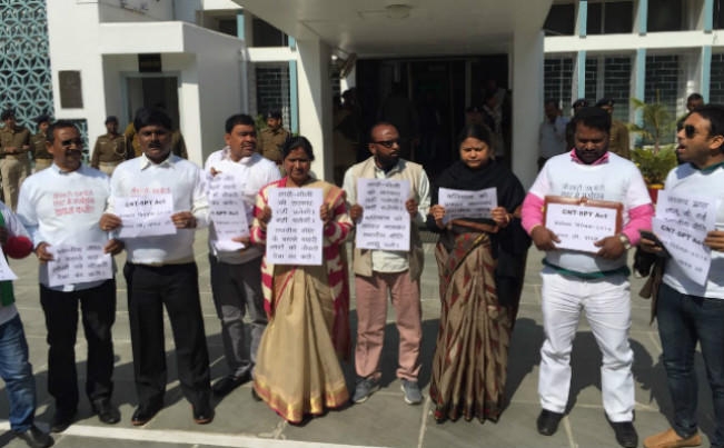 विपक्षी विधायक सीएनटी-एसपीटी एक्ट वापस लो के स्लोगन लिखी तख्तियां लिये हुए थे. साथ ही उनकी तख्तियों पर लिखा था कि लाठी-डंडे की सरकार नहीं चलेगी.