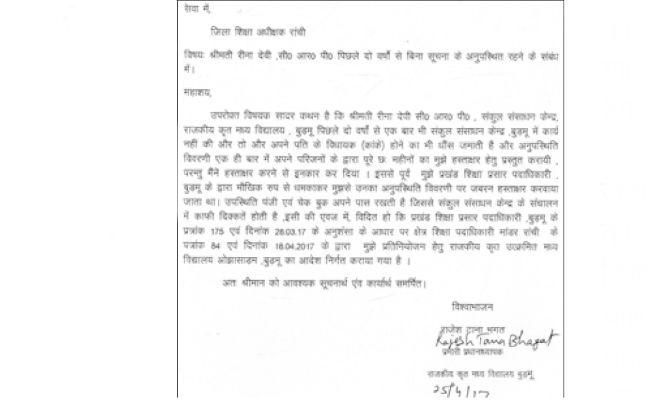 इससे पूर्व प्रखंड शिक्षा प्रसार पदाधिकारी द्वारा जबरन मौखिक रूप से धमका कर अनुपस्थिति पंजी पर मुझसे हस्ताक्षर करवाया जाता था. आवेदन में यह भी आरोप है कि सीआरपी रीना देवी उपस्थिति पंजी व चेकबुक अपने पास रखती हैं, जिससे संकुल संसाधन केंद्र के संचालन में काफी दिक्कत हो रही है. राजेश टानाभगत ने कहा है कि उन्होंने इसका विरोध किया, तो बीइइअो बुढ़मू द्वारा मेरा प्रतिनियोजन राजकीयकृत उत्क्रमित मध्य विद्यालय ओझासाड़म में कर दिया गया.