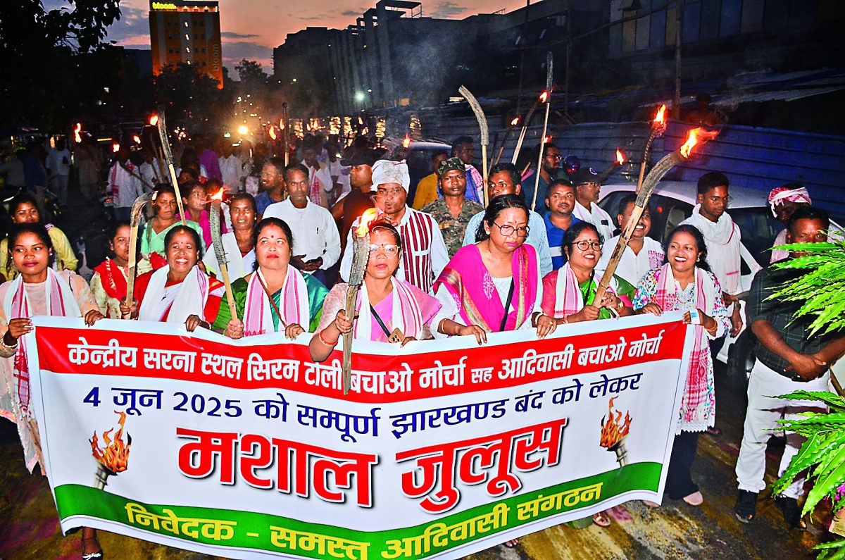 रांची. केंद्रीय सरना स्थल सिरमटोली बचाओ मोर्चा और आदिवासी बचाओ मोर्चा की ओर से चार जून को झारखंड बंद का आह्वान किया गया. बंद की पूर्व संध्या पर मंगलवार को मशाल जुलूस निकाला गया. आदिवासी संगठनों के लोग शाम में जयपाल सिंह स्टेडियम में एकत्र हुए और वहां से नारे लगाते हुए अलबर्ट एक्का चौक पर पहुंचे. इस अवसर पर मोर्चा के प्रतिनिधि गीताश्री उरांव, निरंजना हेरेंज, प्रेमशाही मुंडा, कुंदरसी मुंडा, सूरज टोप्पो, राहुल तिर्की, आकाश तिर्की, केंद्रीय सरना समिति के बबलू मुंडा, फूलचंद तिर्की सहित अन्य प्रतिनिधि मौजूद थे. इस दौरान लोगों से बंद को सफल बनाने में सहयोग करने की अपील की गयी.रैंप निर्माण का विरोध, सरना स्थल की रक्षा की मांग