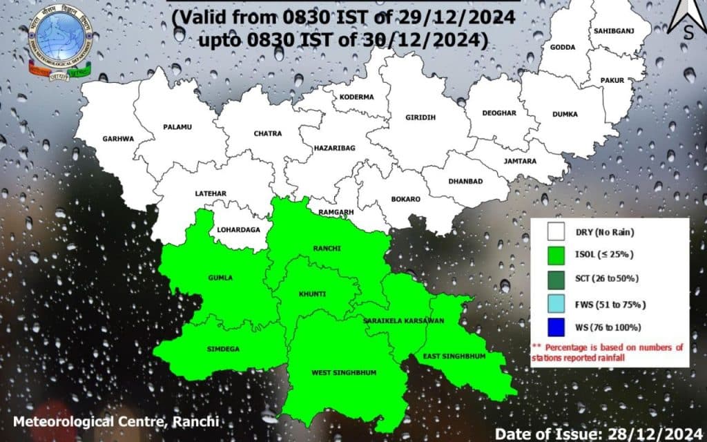 Aaj Ka Mausam 29 December| झारखंड के दक्षिणी और उससे सटे मध्य भागों में रविवार को बारिश होने के आसार हैं. भारत मौसम विज्ञान विभाग (आईएमडी) के रांची स्थित मौसम केंद्र ने यह जानकारी दी है. मौसम केंद्र ने कहा है कि रविवार (29 दिसंबर) को सुबह हल्के से मध्यम दर्जे का कोहरा या धुंध रहने की संभावना है. राज्य के दक्षिणी तथा उससे सटे मध्य भागों यानी पूर्वी सिंहभूम, पश्चिमी सिंहभूम, सरायकेला-खरसावां, सिमडेगा, रांची, खूंटी और गुमला जिले में कहीं-कहीं हल्के से मध्यम दर्जे की वर्षा होने की संभावना है. मौसम विभाग ने कहा है कि अगले 2 दिन तक न्यूनतम तापमान में कोई बड़ा बदलाव नहीं होगा. इसके बाद अगले 3 दिन में न्यूनतम तापमान में 3 से 4 डिग्री तक की गिरावट आएगी.