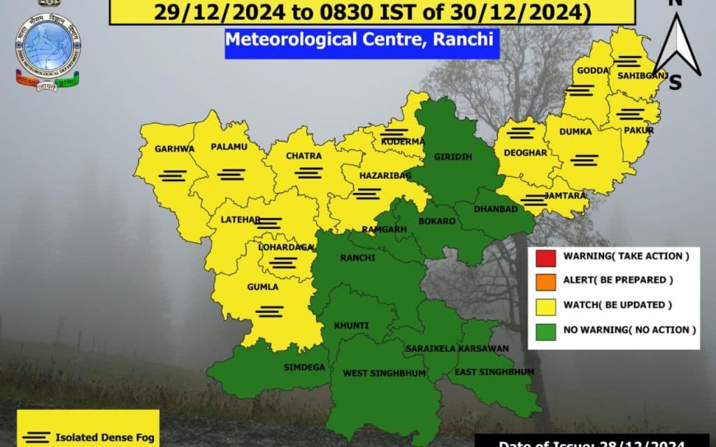 मौसम केंद्र रांची ने कोहरे का येलो अलर्ट भी जारी किया है. कहा है कि झारखंड के उत्तर-पश्चिमी और उससे सटे मध्य एवं उत्तर-पूर्वी भागों में सुबह के समय कहीं-कहीं घना कोहरा देखा जा सकता है. जिन जिलों में कोहरा छाया रहेगा, उनमें गढ़वा, पलामू, लातेहार, लोहरदगा, गुमला, चतरा, हजारीबाग, कोडरमा, देवघर, जामताड़ा, दुमका, पाकुड़, गोड्डा और साहिबगंज जिले शामिल हैं.