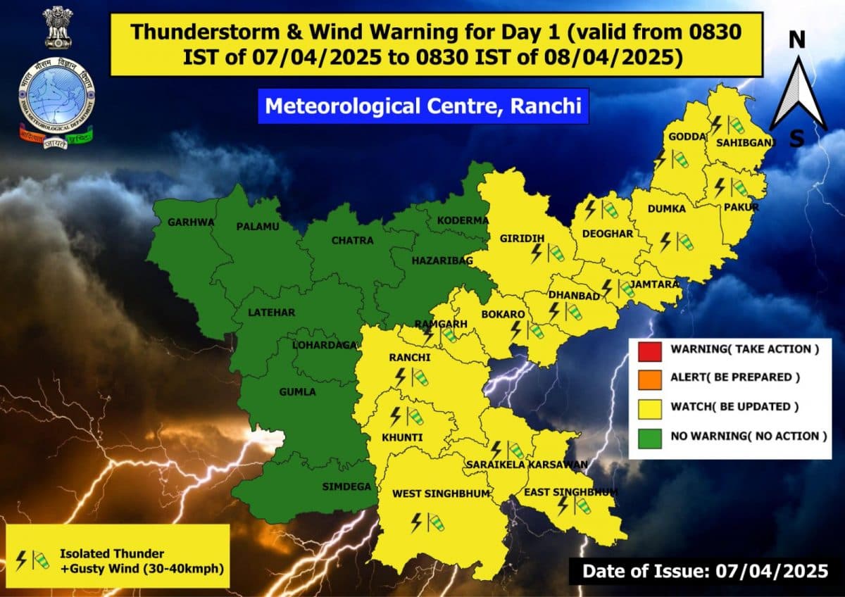 झारखंड में अब तपती गर्मी से राहत मिलनेवाली है. आज से प्रदेश में बारिश की संभावना है. मौसम विभाग के पूर्वानुमान के मुताबिक 13 अप्रैल तक मौसम का मिजाज बदला-बदला रहेगा. गरज के साथ कहीं-कहीं बारिश की संभावना है. तेज हवाओं के झोंके भी चलेंगे. 30 से 40 किलोमीटर प्रति घंटे की रफ्तार से हवाएं चल सकती हैं. वज्रपात की भी आशंका है. मौसम विभाग ने येलो अलर्ट जारी किया है.