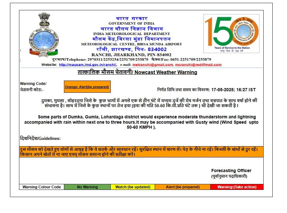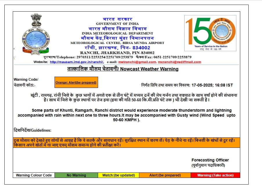 खूंटी और रामगढ़ के लिए ऑरेंज अलर्ट