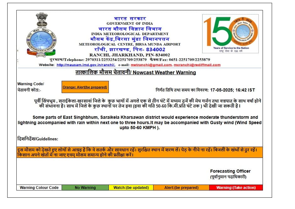 पूर्वी सिंहभूम और सरायकेला खरसावां के लिए भी चेतावनी
