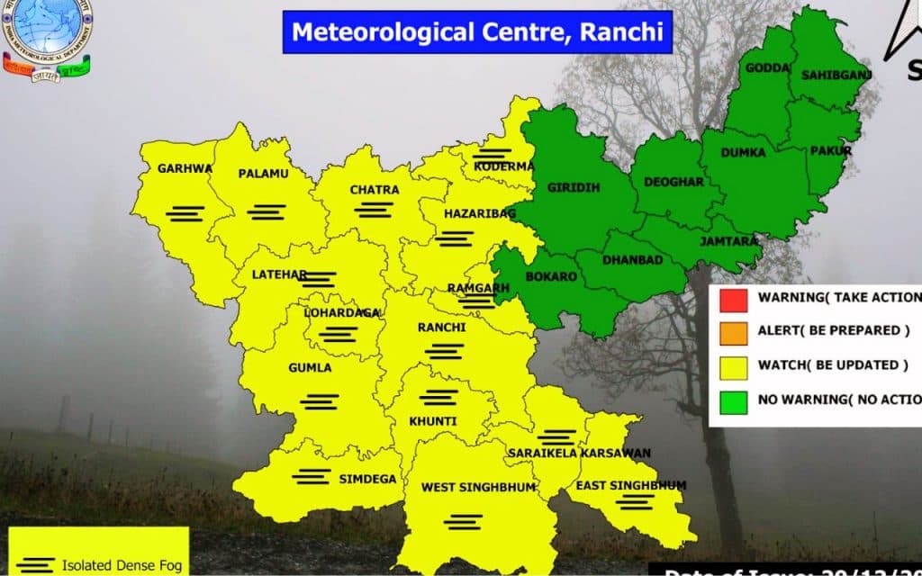 इससे पहले मौसम विभाग ने कहा कि राज्य के मध्य (रांची, गुमला, हजारीबाग, खूंटी, रामगढ़) एवं दक्षिणी (पूर्वी सिंहभूम, पश्चिमी सिंहभूम, सिमडेगा, सरायकेला खरसावां) भागों में शनिवार की सुबह में कहीं-कहीं घना कोहरा देखा जा सकता है. मौसम विभाग ने घने कोहरे का येलो अलर्ट जारी किया है.