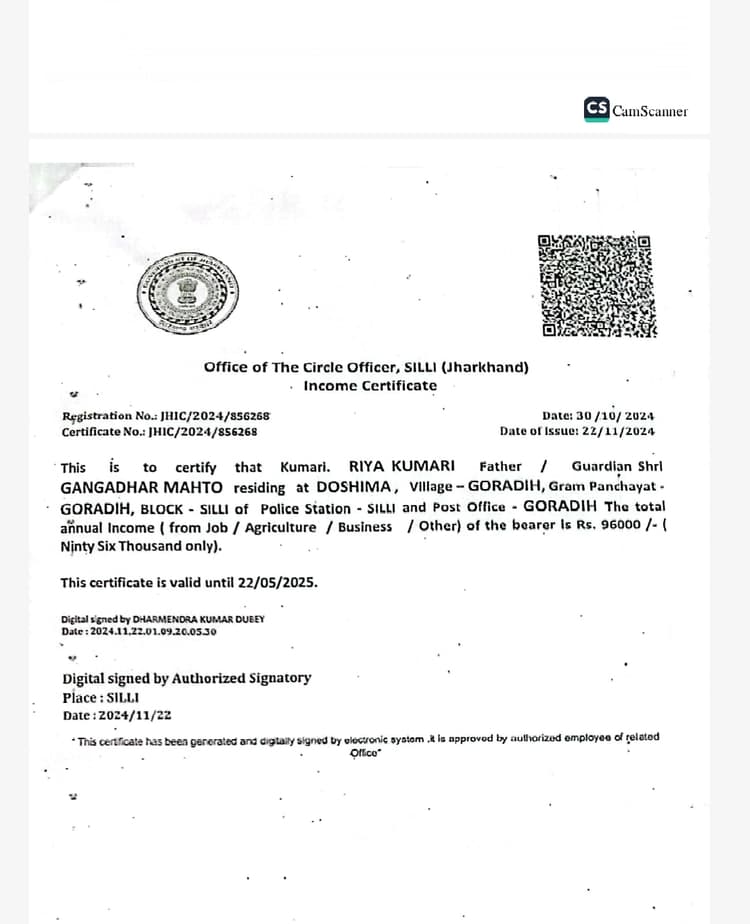कयूमप्रज्ञा केंद्र द्वारा रिया कुमारी के आवेदन पर जाति प्रमाण पत्र बनाने के लिए जो आय प्रमाण पत्र अपलोड किया गया है, उसमें सिल्ली अंचल कार्यालय से निर्गत किये जाने की तिथि 12.11.2024 है. लेकिन जारी तिथि के मुताबिक आय प्रमाण पत्र में वर्तमान सीओ अरुणिमा एक्का का हस्ताक्षर होना चाहिए. परंतु उसमें तत्कालीन सीओ धर्मेंद्र दुबे के हस्ताक्षर हैं. यहीं से मामला पकड़ में आया.