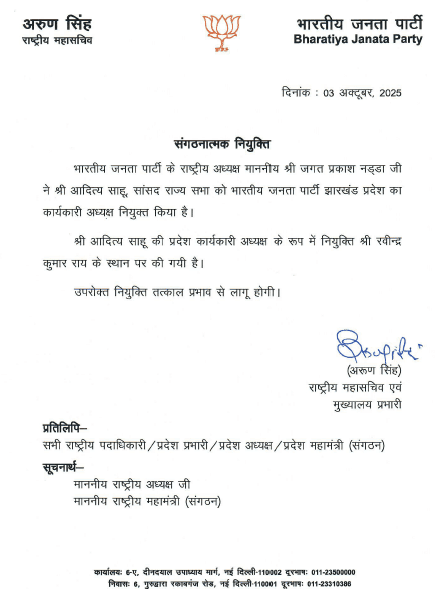 Jharkhand News : आदित्य साहू को बनाया गया कार्यकारी अध्यक्ष, बीजेपी ने झारखंड को लेकर किया बड़ा फैसला