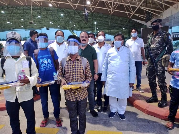 अंडमान निकोबार द्वीप समूह में फंसे प्रवासी मजदूरों के बिरसा मुंडा हवाई अड्डे पर आगमन के बाद स्वच्छता एवं पेयजल मंत्री मिथलेश ठाकुर एवं विधायक स्टीफन मरांडी ने सरकार की ओर से गुलाब का फूल देकर स्वागत किया. सरकार की ओर से बताया गया कि मुख्यमंत्री की लगातार निगरानी में नगर विकास विभाग, परिवहन विभाग, श्रम विभाग एवं कोरोना नियंत्रण कक्ष द्वारा पोर्टब्लेयर में स्थानीय जिला प्रशासन और पुलिस के समन्वय से श्रमिकों को लाने का लक्ष्य साधा गया.