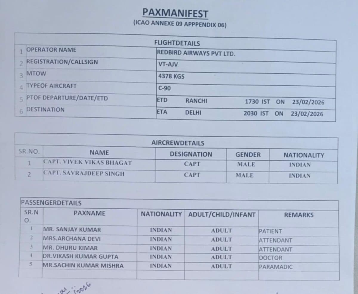 डीजीसीए ने एक बयान में कहा, 23 फरवरी 2026 को रेडबर्ड एयरवेज प्राइवेट लिमिटेड का बीचक्राफ्ट सी90 विमान वीटी-एजेवी, रांची-दिल्ली मार्ग पर चिकित्सा निकासी (एयर एम्बुलेंस) उड़ान पर था, (लेकिन) यह झारखंड के चतरा जिले की कसरिया पंचायत में दुर्घटनाग्रस्त हो गया. विमान में चालक दल के दो सदस्यों सहित सात लोग सवार थे. विमान ने भारतीय समयानुसार 19:11 बजे रांची से उड़ान भरी. कोलकाता से संपर्क स्थापित होने के बाद, भारतीय समयानुसार 19:34 बजे, विमान का वाराणसी से लगभग 100 समुद्री मील दक्षिण-पूर्व स्थित कोलकाता से संचार और रडार संपर्क टूट गया.
