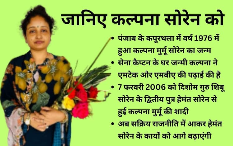 भारतीय सेना के कैप्टन के घर में जन्मी कल्पना मुर्मू सोरेन सोमवार (4 मार्च 2024) को राजनीति में एंट्री कर रहीं हैं. उनका जन्म पंजाब के कपूरथला में हुआ. कपूरथला में जन्मी कल्पना का नाम कपूरथला से ही मिलता-जुलता है. कपूरथला में जन्मीं कल्पना सोरेन ने एमटेक और एमबीए की पढ़ाई की है.