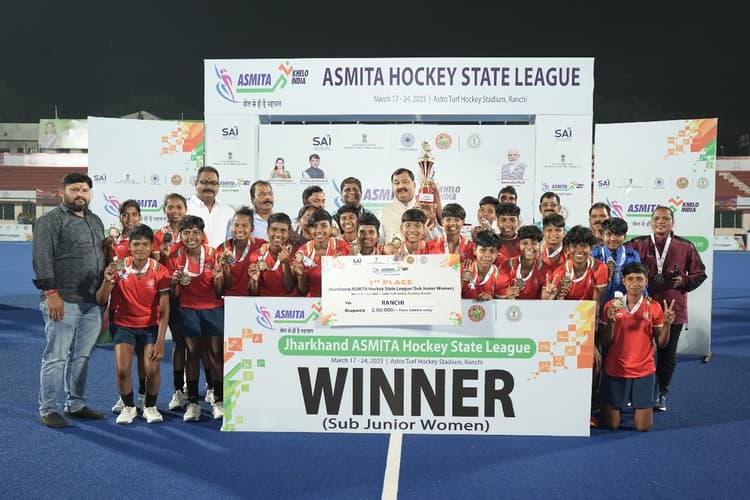 रांची. झारखंड अस्मिता हॉकी लीग के सब जूनियर वर्ग में रांची व जूनियर वर्ग में सिमडेगा की टीम चैंपियन बनी. जूनियर महिला हॉकी के फाइनल में सिमडेगा ने हजारीबाग को 2-0 गोल से हराया. वहीं, सब जूनियर के फाइनल में रांची ने सिमडेगा को 1-0 से पराजित कर खिताब जीता. तीसरे और चौथे स्थान के लिए खेले गये मैच में खूंटी ने पलामू को 2-1 से हराया. इसके अलावा जूनियर वर्ग में खूंटी ने पलामू को 2-1 से पराजित कर तीसरा स्थान प्राप्त किया. दोनों वर्ग में विजेता टीमों को दो-दो लाख रुपये, उप विजेताओं को 1.60 लाख व तीसरे स्थान पर रहनेवाली टीम को 1.20 लाख रुपये का चेक, ट्रॉफी व मेडल देकर सम्मानित किया गया. मौके पर हॉकी इंडिया के महासचिव भोलानाथ सिंह, हॉकी झारखंड के सीइओ रजनीश कुमार, सचिव विजय शंकर सिंह, उपाध्यक्ष मनोज कोनबेगी, जयंत केरकेट्टा समेत अन्य मौजूद थे.