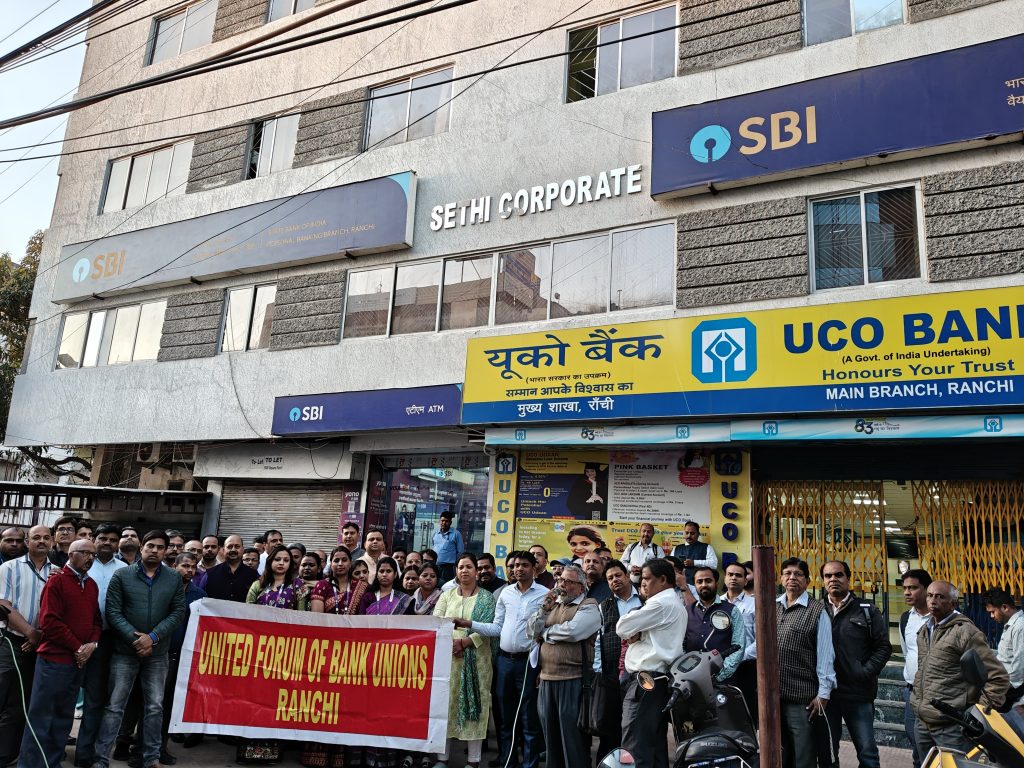 Ranchi News : पांच दिवसीय कार्य सप्ताह को लेकर बैंक यूनियन का प्रदर्शन