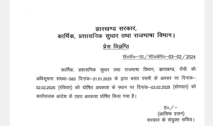 झारखंड के कार्मिक, प्रशासनिक सुधार तथा राजभाषा विभाग ने शुक्रवार को जारी अधिसूचना में कहा है कि बसंत पंचमी के अवसर पर दो फरवरी (रविवार) को घोषित अवकाश की जगह तीन फरवरी (सोमवार) को कार्यपालक आदेश के तहत अवकाश घोषित किया गया है.