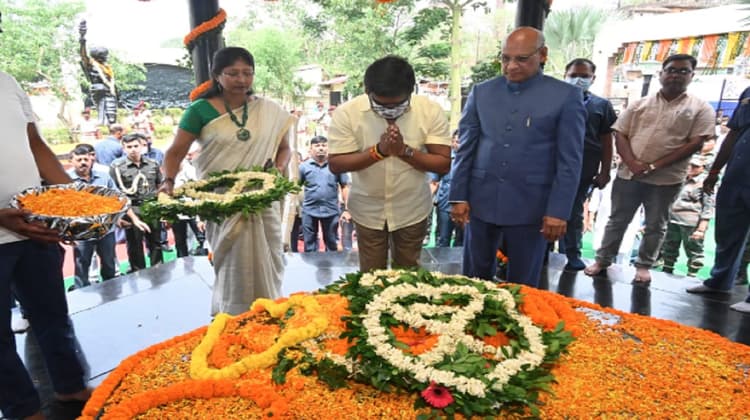 रांची : धरती आबा भगवान बिरसा मुंडा की 122 वीं शहादत दिवस आज राजधानी रांची में मनाया जा रहा है. इस मौके पर बिरसा मुंडा के समाधि स्थल कोकर डिस्टलरी पुल के समीप स्थित प्रतिमा पर राज्यपाल रमेश बैस, मुख्यमंत्री हेमंत सोरेन, राज्यसभा सांसद महुआ माजी सहित अन्य ने गुरुवार को उन्हें श्रद्धांजलि दी. इसके बाद राज्यपाल और सीएम बिरसा चौक भी गए जहां पर उनकी प्रतिमा पर माल्यार्पण किया. राज्यपाल रमेश बैस और मुख्यमंत्री हेमंत सोरेन एक ही गाड़ी से कोकर के समाधि स्थल पहुंचे. इसके बाद ये बिरसा चौक के लिए रवाना हो गये. जहां पर इन्होंने बिरसा मुंडा की प्रतिमा पर श्रद्धासुमन अर्पित किया.