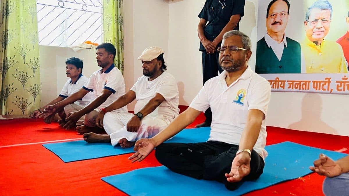 अंतरराष्ट्रीय योग दिवस पर योगाभ्यास करते झारखंड भाजपा के नेता और कार्यकर्ता.