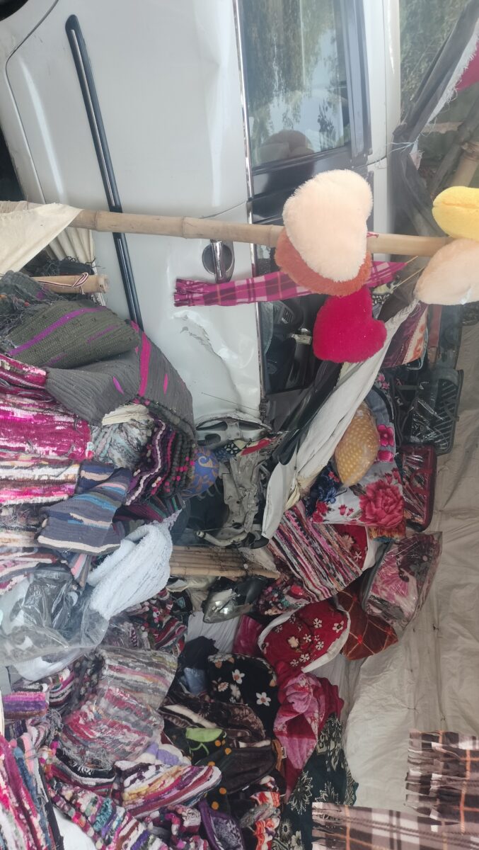 ट्रैक्टर और कार में भिड़ंत होने के बाद कार सड़क के किनारे लगी एक कंबल की दुकान में घुस गयी.