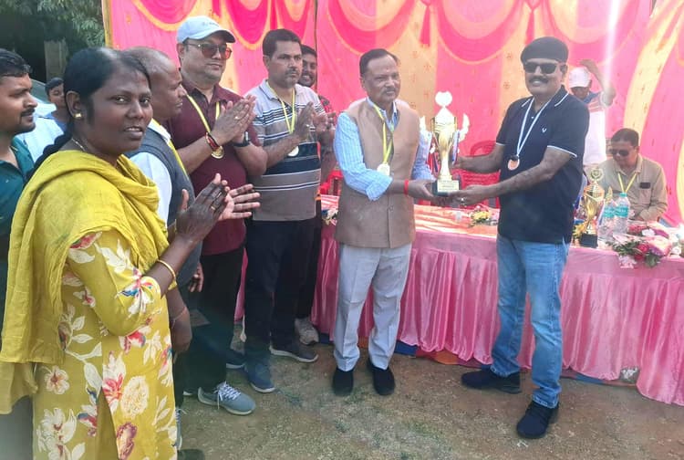 चान्हो 1, विजेता टीम के कप्तान को ट्राॅफी देते डॉ पी चंद्रा व अन्य.B