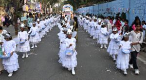 शोभायात्रा में 30 से ज्यादा समूह शामिल हुए थे. सबसे आगे क्रूसवीर बच्चे, हाथों में क्रूस और कैंडल लेकर चल रहे थे. उसके बाद सफेद वस्त्र और पंखों के साथ परियों के रूप में बच्चियां चल रही थीं. महिला संघ झंडों के साथ थीं. आर्चबिशप विसेंट आईंद, फादर अजीत खेस और फादर आनंद डेविड एक सुसज्जित वाहन पर सवार थे. इसके बाद विभिन्न शिक्षण संस्थानों और टोला मोहल्ला के विश्वासी कतारबद्ध होकर चल रहे थे. विश्वासी अनुशासित ढंग से मसीह की स्तुतिगान के साथ चल रहे थे. इस दौरान ख्रीस्त की स्तुति करो…, वह प्यारा प्रभु है हमारा, जीवन बसर यीशु होके हमर, सृष्टि है तेरी कविता, ख्रीस्त ही राजा ख्रीस्त विजेता, राजाओं का राजा यीशु जैसे कई गीत प्रस्तुत किये गये.पुरुलिया रोड में ख्रीस्त राजा के लगे थे कटआउट
