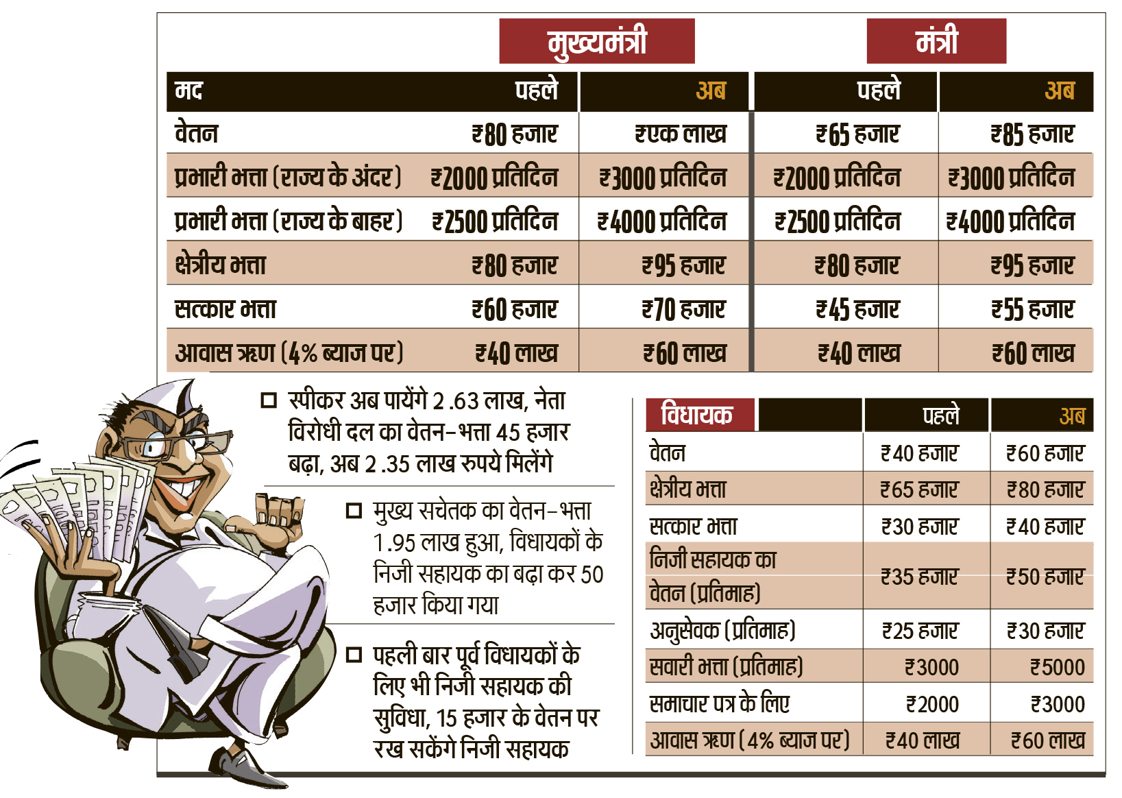 कैबिनेट ने बुधवार को मुख्यमंत्री, मंत्री, सचेतक और विधायकों के वेतन-भत्ता में बढ़ोतरी काे मंजूरी दे दी है. पूर्व विधायकों की पेंशन भी बढ़ायी गयी है. कैबिनेट के फैसले के बाद मुख्यमंत्री को वेतन व भत्ता मद में पहले मिलनेवाली राशि 2.90 लाख रुपये से बढ़ कर 3.90 लाख रुपये हो गयी है. मुख्यमंत्री का मूल वेतन 80 हजार रुपये से बढ़ कर एक लाख रुपये हो गया है. वहीं प्रभारी, क्षेत्रीय, सत्कार भत्ता में भी बढ़ोतरी की गयी है. मुख्यमंत्री और मंत्रियों के भत्ते में समान वृद्धि की गयी है. राज्य के मंत्री पहले वेतन-भत्ता 1.90 लाख रुपये पाते थे. कैबिनेट के फैसले के बाद इनको 2.35 लाख रुपये मिलेंगे. इनके वेतन और भत्ता 45 हजार रुपये बढ़ेंगे. स्पीकर के वेतन व भत्ते में 45 हजार रुपये की वृद्धि है. अब उन्हें 2.63 लाख रुपये मिलेंगे. वहीं, विधायकों के वेतन और भत्ता में 48 हजार रुपये की बढ़ोतरी हुई है. विधायक के मूल वेतन 40 हजार रुपये में 20 हजार रुपये बढ़ कर मिलेंगे. पहले विधायक वेतन और भत्ता सहित 1.40 लाख रुपये मिलते थे, अब वे 1.88 लाख रुपये पायेंगे. विधायकों के निजी सहायक का वेतन 30 हजार से बढ़ कर 50 हजार हो गया है. वहीं, कंप्यूटर और लैपटॉप के लिए विधायकों को पहले 70 हजार मिलते थे, अब इसे एक लाख तक की राशि मिल सकती है. विधायक के अनुसेवक का तनख्वाह पांच हजार बढ़ायी गयी है. अब इनको 30 हजार मिलेंगे. प्रतिपक्ष के नेता के वेतन व भत्ता में भी 45 हजार की बढ़ोतरी हुई है. अब वह 2.35 लाख रुपये पायेंगे. मुख्य सचेतक व सचेतक के वेतन व भत्ता में भी वृद्धि है. मुख्य सचेतक का वेतन-भत्ता 1.51 लाख रुपये से 1.95 लाख रुपये हो गया है.विधायकों को आवास ऋण में 20 लाख की वृद्धि :