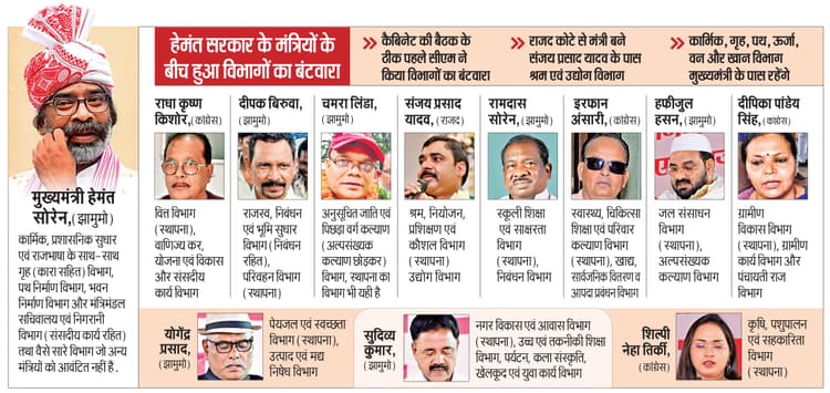 राजद कोटे से मंत्री बने संजय प्रसाद यादव को श्रम एवं उद्योग विभाग दिया गया है. पूर्व में भी राजद कोटे में यही दो विभाग मिले थे. पूर्व में इरफान अंसारी ग्रामीण विकास मंत्री थे, लेकिन इस बार उन्हें स्वास्थ्य, खाद्य आपूर्ति एवं आपदा प्रबंधन विभाग दिया गया है. उनकी जगह पर दीपिका पांडेय सिंह को ग्रामीण विकास विभाग दिया गया है. जबकि, दीपिका के पास पूर्व में कृषि विभाग था, इसे पहली बार मंत्री बनी शिल्पी नेहा तिर्की को दिया गया है. स्कूली शिक्षा विभाग झामुमो कोटे से मंत्री बने रामदास सोरेन को दिया गया है. जबकि, नगर विकास विभाग झामुमो से ही मंत्री बने सुदिव्य कुमार को दिया गया है. झामुमो के दीपक बिरुवा को राजस्व के साथ-साथ परिवहन विभाग दिया गया है. जबकि, चमरा लिंडा को अनुसूचित जनजाति, अनुसूचित जाति एवं पिछड़ा वर्ग कल्याण (अल्पसंख्यक कल्याण को छोड़कर) विभाग दिया गया है. मंत्रियों के स्थापना विभाग की अधिसूचना भी जारी कर दी गयी है.क्या है स्थापना विभाग