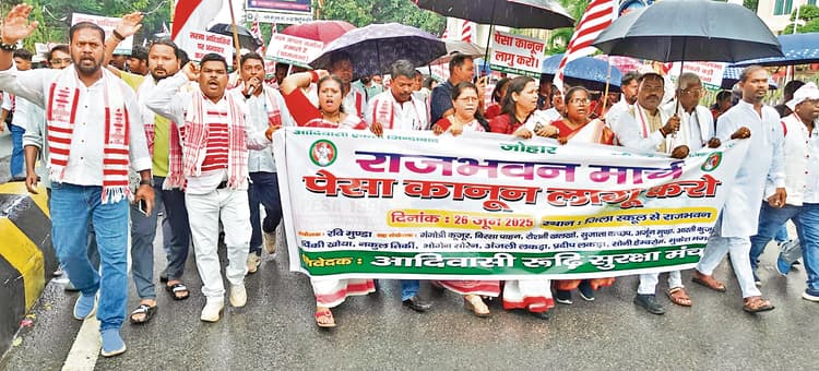 जगलाल पाहन ने कहा कि हम आदिवासी प्रकृति पूजक हैं. रूढ़ीवादी परंपरा में हमारी आत्मा बसती है. पेसा कानून हमारी रूढ़ि परंपरा और संस्कृति को संरक्षित करता है. अशोक बड़ाईक ने कहा कि हेमंत सोरेन सरकार पिछले छह वर्षों से पेसा के नाम टाल-मटोल कर रही है. जबकि, पेसा ड्राफ्ट की प्रक्रिया पूरी हो चुकी है. राजभवन मार्च में अर्जुन मुंडा, आरती कुजूर, रोशनी खलखो, पिंकी खोंया, नकुल तिर्की, भोगेन सोरेन, बिरसा पाहन, बबलू मुंडा, सन्नी तिर्की, मुन्नी मुंडा, रितेश उरांव, सुजाता कच्छप, रूप लक्ष्मी मुंडा, शांति टोप्पो समेत काफी संख्या में लोग उपस्थित थे.