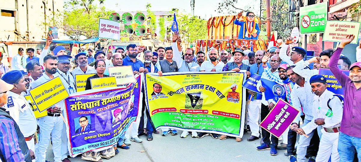 रांची. एससी, एसटी, ओबीसी व अल्पसंख्यक समाज को उनके अधिकारों के प्रति जागरूक करने को लेकर शनिवार को पुराने विधानसभा के समीप से डोरंडा स्थित भीमराव अंबेडकर चौक तक संविधान सम्मान रक्षा यात्रा निकाली गयी. इस कार्यक्रम में एसटी, एससी, ओबीसी एवं अल्पसंख्यक समाज के लोगों की भागीदारी रही. बाबा साहेब भीमराव अंबेडकर के प्रतीकात्मक स्वरूप को फूलों से सजी गाड़ी में रखकर यात्रा में शामिल लोगों ने उनके जयकारे लगाये. इस दौरान लोग अपनी मांगों की तख्ती भी लिये हुए थे. यात्रा मार्ग में बिरसा मुंडा, कर्पूरी ठाकुर, संत रविदास व भीमराव अंबेडकर की प्रतिमा पर श्रद्धा सुमन अर्पित किया गया. यात्रा का समापन अल्बर्ट एक्का चौक स्थित शहीद अल्बर्ट एक्का की प्रतिमा पर श्रद्धा सुमन अर्पित कर किया गया. यात्रा के दौरान सरकार से एससी, एसटी, ओबीसी की जातीय जनगणना कराने और संविदा पर बहाली बंद करने की मांग की गयी. यात्रा में आरपी रंजन, देव कुमार धान, दशरथ चंद्र दास, रामलाल राम, विद्याधर प्रसाद, शमीम खान, पुनिया नायक, तुरी सुंडी, अशोक चौरसिया समेत कई लोग शामिल थे.