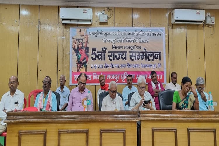 9 अगस्त को देशव्यापी मजदूर महापड़ाव का आगाज होगा. आज विधायक क्लब धुर्वा रांची में अयोजित निमार्ण मजदूर यूनियन के 5वें राज्य सम्मेलन की अध्यक्षता पांच सदस्यीय अध्यक्ष मंडल ने की. इनमें भुवनेश्वर बेदिया, सुभाष मंडल, अमल घोष, भीम साहू, रोजलिन तिर्की शामिल थे. सम्मेलन की शुरूआत मजदूर आन्दोलन के शहीदों, धनबाद, बालासोर एवं काम 4के दौरान दुघर्टना में मृत मज़दूरों को एक मिनट का मौन श्रृद्धांजलि देकर हुई. सम्मेलन का झंडोतोलन वयोवृद्ध मजदूर नेता एनामुल हक ने किया. सम्मेलन के मसौदे पर 24 प्रतिनिधियों ने अपने सुझाव और विचार रखे. प्रस्तावित दस्तावेज यूनीयन के महासचीव भुवनेशवर केवट ने पेश किया. राज्य सम्मेलन को विरादरना संगठन झामकिस के अध्यक्ष देवकी नंदन बेदिया, आंदोलनकारी पुष्कर महतो, सेख सहदूल, विजय गिरी, आर पी वर्मा, सुखदेव उरांव, काली मिंज आदि ने संबोधित किया.