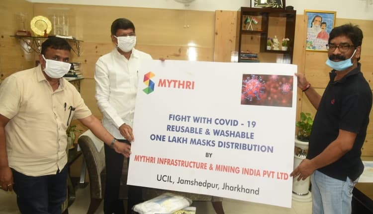 रांची : मुख्यमंत्री हेमंत सोरेन (CM Hemant Soren) से शनिवार को कांके रोड स्थित मुख्यमंत्री आवास में मैत्री इंफ्रास्ट्रक्चर एंड माइनिंग इंडिया प्राइवेट लिमिटेड के चेयरमैन टी श्रीनिवास राव ने मुलाकात की. इस दौरान टी श्रीनिवास राव ने कोरोना वायरस (Coronavirus) की रोकथाम के लिए एक लाख वासेबल एंड री-यूज मास्क राज्य सरकार को दिया.