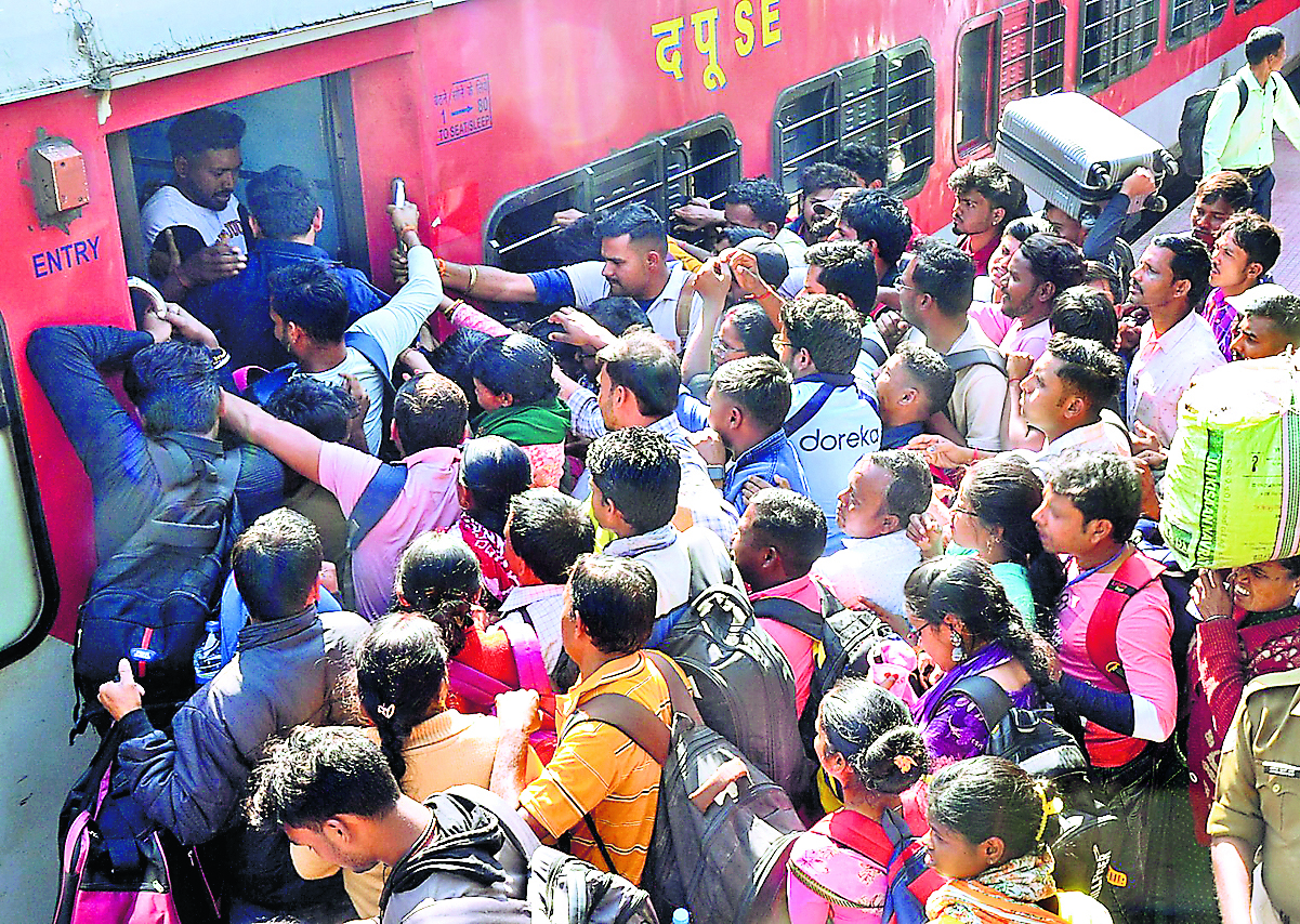 रांची. महाकुंभ जानेवाले लोगों की सोमवार को रांची रेलवे स्टेशन पर एक बार फिर जबर्दस्त भीड़ दिखी. स्टेशन पर पैर रखने की जगह नहीं थी. हर कोई ट्रेन में सवार होने के लिए जद्दोजहद करता दिखा. वहीं आरपीएफ जवानों की व्यवस्था भी धरी की धरी रह गयी. हटिया-आनंद विहार ट्रेन में सवार होने के लिए हटिया स्टेशन के बाहर यात्रियों को लाइन में लगाकर प्रवेश दिया गया. जेनरल और स्लीपर क्लास की बोगी यात्रियों से भर गयी. वहीं रांची स्टेशन में भी यात्रियों को लाइन लगाकर स्टेशन परिसर में प्रवेश दिया गया. लेकिन जब ट्रेन दोपहर 2.10 बजे पहुंची, तो पहले से भरी बोगियों में यात्रियों के सवार होने की जद्दोजहद शुरू हो गयी.