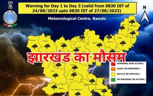मौसम विभाग ने 26 अगस्त को भी प्रदेश में कहीं-कहीं वर्षा और वज्रपात की आशंका व्यक्त की है. साथ ही कहा है कि आने वाले 24 घंटे के दौरान अधिकतम तापमान में गिरावट दर्ज की जागी. इसके बाद दो-तीन दिन तक उच्चतम तापमान में कोई बड़ा बदलाव होता नहीं दिख रहा है. झारखंड के अधिकतर हिस्से में बारिश होने के बावजूद रांची, जमशेदपुर, डालटेनगंज, बोकारो और चाईबासा का अधिकतम तापमान सामान्य से अधिक है. रांची और बोकारो का न्यूनतम तापमान सामान्य से अधिक है.
