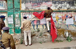 रांची : प्रतिबंधित उग्रवादी संगठन तृतीय सम्मेलन प्रस्तुति कमेटी (टीएसपीसी) ने राजभवन के पीछे नगर निगम अस्पताल की दीवार पर पोस्टर साट कर रांची पुलिस को खुली चुनौती दी है. हाई सिक्यूरिटी इलाके में पोस्टर साटे जाने की सूचना मिलते ही सुखदेवनगर थाना की पुलिस मौके पर पहुंची और पोस्टर-बैनर उखाड़ कर साथ ले गयी. इस संबंध में अज्ञात लोगों के खिलाफ प्राथमिकी दर्ज की गयी है.