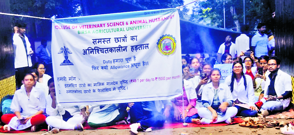 रांची. बीएयू अंतर्गत वेटनरी कॉलेज के विद्यार्थी इंटर्नशिप स्टाइपेंड की राशि तीन हजार से बढ़ा कर अन्य राज्यों की तरह 15 हजार रुपये प्रति माह करने की मांग को लेकर दूसरे दिन भी हड़ताल पर रहे. विद्यार्थी दिन-रात कॉलेज मुख्यालय के समक्ष धरना दे रहे हैं व प्रदर्शन कर रहे हैं. बुधवार को कुलपति के निर्देश पर विवि के डायरेक्टर एडमिनिस्ट्रेशन (डीए) धरना दे रहे विद्यार्थियों को समझाने पहुंचे, लेकिन विद्यार्थी अपनी मांगों पर अड़े थे तथा धरनास्थल पर कुलपति को बुलाने की मांग करने लगे. डीए ने विद्यार्थियों से कहा कि उनकी जो भी मांगें हैं, उस पर 19 सितंबर को वित्त समिति की बैठक में निर्णय लिया जायेगा. वार्ता के बीच में ही एक विद्यार्थी द्वारा वीडियो बनाये जाने पर डीए ने आपत्ति जतायी तथा उसे पकड़ने के लिए लपके. इस पर वहां अफरा-तफरी मच गयी व हंगामा होने लगा. इस पर डीए भी भड़क गये. विद्यार्थी डीए को वापस जाने के लिए नारेबाजी करने लगे. विद्यार्थियों के उग्र तेवर को देखते हुए डीए ने कहा कि बजट में प्रावधान ही नहीं है. इसलिए स्टाइपेंड की राशि नहीं बढ़ सकती है और वापस लौट गये. हालांकि विद्यार्थियों ने आरोप लगाया कि उन्होंने जाते-जाते सभी विद्यार्थियों को धमकी भी दी है.डीए के व्यवहार पर नाराजगी जतायी