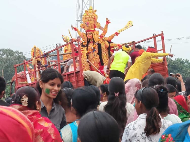 पिपरवार. पिपरवार क्षेत्र की सार्वजनिक दुर्गा पूजा, बचरा की प्रतिमाओं का शनिवार को विसर्जन किया गया. इस अवसर पर काफी संख्या में महिलाओं ने मां दुर्गा को नम आंखों से अगले वर्ष जल्द आने की कामना के साथ विदा किया. विदाई के दौरान महिलाओं ने सिंदूर खेला किया. बंगाली महिलाओं ने सिंदूर खेला के दौरान पारंपरिक नृत्य भी किया. बाद में प्रशासन की देख-रेख में पूजा कमेटी द्वारा प्रतिमाओं के साथ विसर्जन जुलूस निकाला गया. इसमें शामिल लोगों ने एक-दूसरे को गुलाल लगाते हुए डीजे साउंड पर खूब डांस किया. प्रतिमाओं को आवासीय परिसरों में भ्रमण कराने के बाद रात्रि में सपही नदी में विसर्जित कर दिया गया. इधर, पूजा खत्म हो जाने के बाद भी बचरा में मेला की रौनक बनी हुई है. लोग मेले में जम कर खरीदारी कर रहे हैं. वहीं, बच्चे झूला, नाव, ड्रैगन आदि का आनंद ले रहे हैं. पूजा कमेटी की ओर से शनिवार रात ऑरकेस्ट्रा का आयोजन किया गया. ऑरकेस्ट्रा में सीसीएल के स्थानीय कलाकारों ने फिल्मी व भक्ति गीतों पर दर्शकों का रात भर मनोरंजन किया.