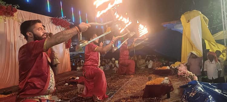 03 खलारी06:-गंगा आरती करते श्रद्धालु.