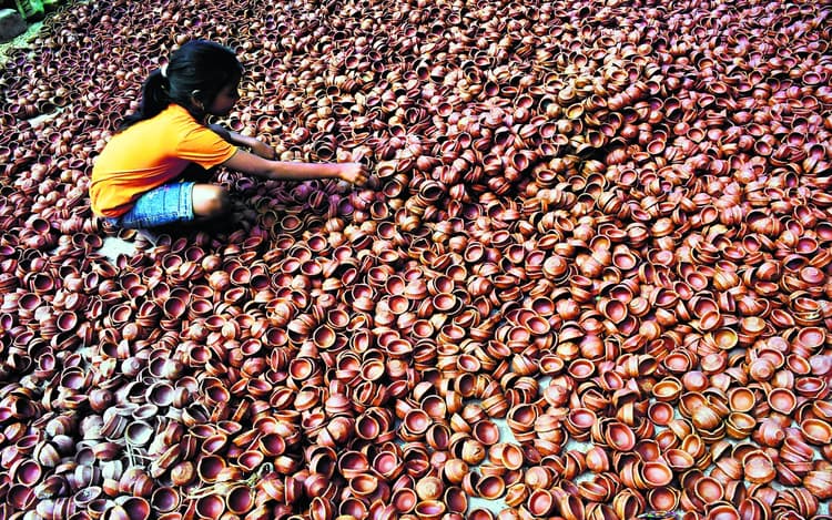 Diwali 2022: दीपावली में एक बार फिर दीया और बाती का मिलन होगा. लोगों के घर-आंगन मिट्टी के दीये से रोशन होंगे. दीपावली के नजदीक आते ही कुम्हार दीये बनाने के काम में तेजी से जुट हुए हैं. इनके चाक तेजी से चलने लगे हैं. पूरा परिवार मिट्टी के दीपक बनाने में लगा है. सबको इस बार अच्छी बिक्री की उम्मीद है. उम्मीद यह भी है कि इस बार उनकी दीपावली भी रोशन रहेगी. मिट्टी के दीये और खिलौने आदि बनाने के लिए माता-पिता के साथ बच्चे भी हाथ बंटा रहे हैं. कोई मिट्टी गूंथ रहा है, तो किसी के हाथ चाक पर मिट्टी के बर्तनों को आकार दे रहे हैं.
