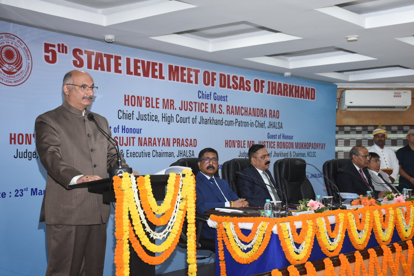 रांची. झारखंड हाइकोर्ट के चीफ जस्टिस एमएस रामचंद्र राव ने कहा कि मुझे जानकर प्रसन्नता हो रही है कि झालसा जरूरतमंद लोगों को विधिक सहायता के माध्यम से न्याय प्रदान करने में अच्छा काम कर रहा है. जिला विधिक सेवा प्राधिकरण (डालसा) विधिक सेवाएं प्रदान करने के लिए प्राथमिक संपर्क बिंदु है और जमीनी स्तर पर न्याय तक पहुंच प्रदान करने की आधारशिला है. डालसा उत्प्रेरक की भूमिका में वंचितों को न्याय दिलाने में सहायक बने. चीफ जस्टिस एमएस रामचंद्र राव रविवार को झालसा की ओर से आयोजित जिला विधिक सेवा प्राधिकरणों की पांचवीं राज्यस्तरीय बैठक को संबोधित कर रहे थे.