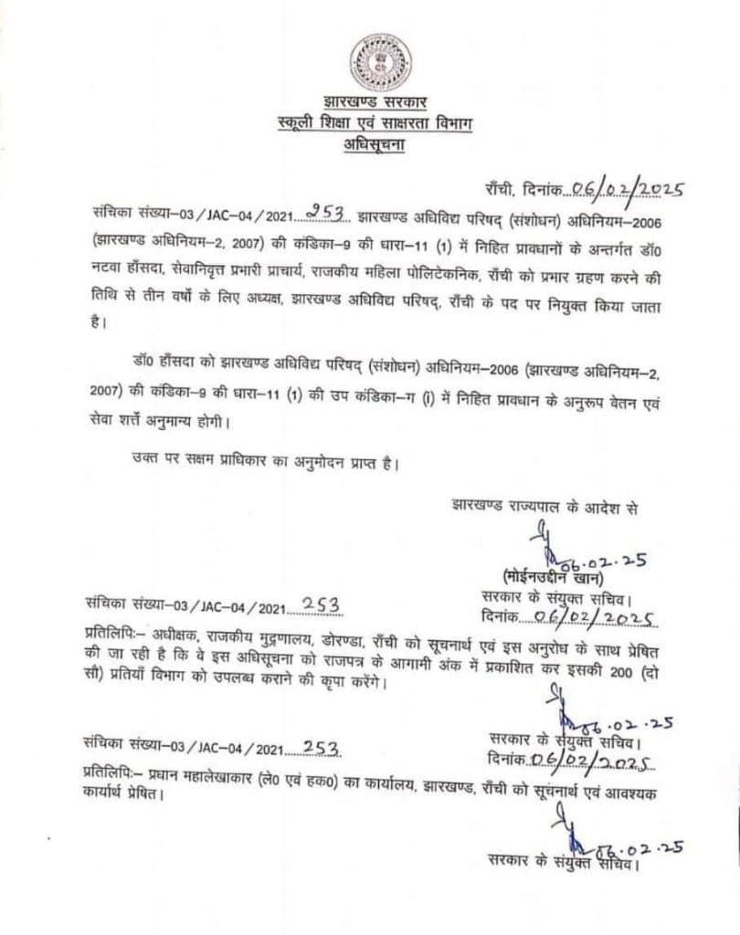 डॉ नटवा हांसदा राजकीय महिला पॉलिटेक्निक रांची के रिटायर्ड प्रभारी प्राचार्य हैं. झारखंड सरकार के संयुक्त सचिव मोईनुद्दीन खान ने झारखंड के राज्यपाल संतोष कुमार गंगवार के आदेश से यह अधिसूचना जारी की है. अधिसूचना में स्पष्ट किया गया है कि झारखंड अधिविद्य परिषद (संशोधन) अधिनियम 2006 (झारखंड अधिनियम-2, 2007) की कंडिका-9 की धारा-11(1) की उप कंडिका-ग(i) में निहित प्रावधान के अनुरूप वेतन एवं सेवा की शर्तें के अनुरूप उन्हें वेतन एवं भत्ते मिलेंगे.