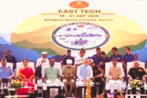 East Tech 2025: राजधानी रांची के खेलगांव में आज शुक्रवार को तीन दिवसीय ईस्ट टेक सिम्पोजियम (डिफेंस एक्सपो) शुरू हुआ. राज्यपाल संतोष गंगवार, सीएम हेमंत सोरेन समेत अन्य विशिष्ट अतिथियों ने दीप प्रज्वलित कर ईस्ट टेक 2025 का भव्य शुभारंभ किया. यह एक्सपो 21 सितंबर तक चलेगा.
