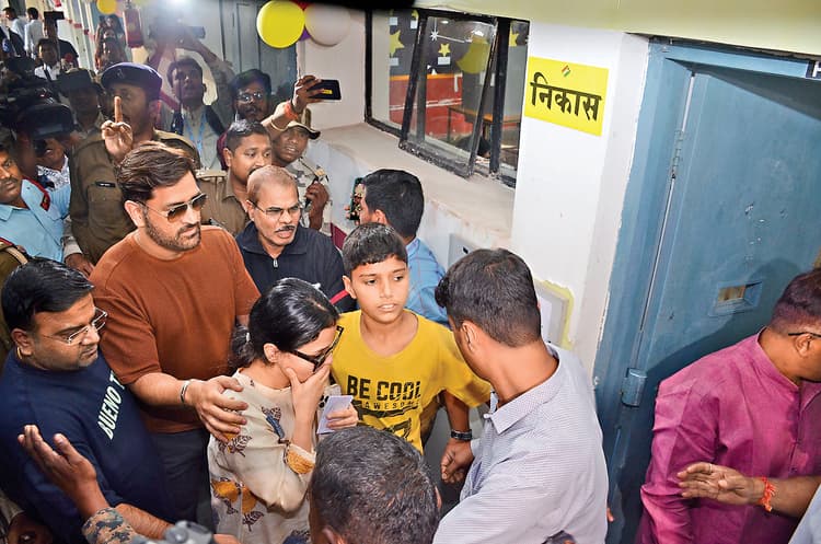 रांची. निर्वाचन आयोग के ब्रांड एंबेसडर व भारतीय क्रिकेट टीम के पूर्व कप्तान महेंद्र सिंह धौनी ने बुधवार को जेवीएम श्यामली स्कूल स्थित बूथ पर मतदान किया. वह दिन के 2.50 बजे पत्नी साक्षी, पिता पान सिंह व माता देवकी देवी के साथ मतदान करने पहुंचे. इसके बाद उन्होंने परिजनों के साथ मतदान केंद्र संख्या 380 में मतदान किया. यहां पहले से काफी संख्या में महेंद्र सिंह धौनी के प्रशंसक मौजूद थे. कॉपर कलर की टीशर्ट व ब्लैक जींस पहन कर धौनी जैसे ही मतदान केंद्र पहुंचे, प्रशंसकों ने उन्हें घेर लिया. इसके बाद सुरक्षाकर्मियों ने घेरे में लेकर धौनी को मतदान केंद्र तक पहुंचाया. वोट देने के बाद उन्होंने मतदान कर्मियों के साथ फोटो भी खिंचवायी. यहां सुरक्षा के कड़े इंतजाम किये गये थे.