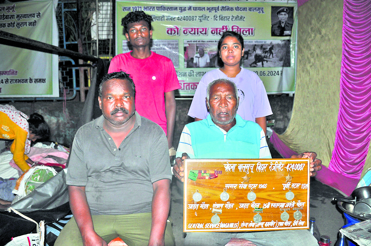 रांची (वरीय संवाददाता). 10 बिहार रेजीमेंट के सिपाही पुदना बलमुचू अपनी मांगों को लेकर पिछले सात दिनों से राजभवन के समक्ष परिवार के साथ धरना पर बैठे हैं. वर्ष 1965 और 1971 की लड़ाई में उन्होंने परमवीर चक्र अल्बर्ट एक्का के साथ युद्ध में दुश्मनों के दांत खट्टे किये थे. उस युद्ध में पैैर में गोली लगने से वह घायल हो गये थे. फिर कुछ दिनों बाद वे सेवानिवृत्त हो गये. सेवानिवृत्ति के बाद पिछले 53 सालों से उन्हें पेंशन की राशि नहीं मिली है. साथ ही झारखंड सरकार की ओर से दी जाने वाली पांच एकड़ जमीन भी उन्हें नहीं मिली है. 140 किलोमीटर पैदल चल कर पहुंचे हैं रांची : चाईबासा निवासी सिपाही पुदना बलमुचू वहां से 140 किलोमीटर पैदल चल कर रांची पहुंचे हैं. वह पिछले सात दिनों से धरना के माध्यम से मुख्यमंत्री तक अपनी बात पहुंचाने का प्रयास कर रहे हैं, लेकिन राज्य सरकार के किसी भी अधिकारी-कर्मचारी ने अब तक उनकी सुध नहीं ली है. पिछले साल भी उन्होंने अपनी मांगों को लेकर धरना दिया था. उस समय मुख्यमंत्री के हस्तक्षेप से चाईबासा डीसी को जमीन देने के लिए कहा गया था, लेकिन उनकी मांग पूरी नहीं की गयी. पुदना बलमुचू द्वारा धरना दिये जाने की जानकारी मिलने पर भूतपूर्व सैनिकों के संगठन वेटेरन ऑर्गनाइजेशन ऑफ झारखंड के अध्यक्ष मुकेश कुमार धरनास्थल पर पहुंचे. उन्होंने सिपाही पुदना बलमुचू की पेंशन के लिए इएसएम डायरेक्टर स्टेशन हेडक्वार्टर से बात की. उन्होंने कहा कि उनकी मांगाें को शीघ्र पूरा करने के लिए वे राज्य सरकार के सक्षम पदाधिकारियाें से भी जल्द मिलेंगे. साथ ही संगठन के प्रतिनिधि रक्षा राज्य मंत्री के सामने सिपाही पुदना बलमुचू की समस्या को रखेंगे.