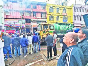 रांची. अपर बाजार के महावीर चौक स्थित शर्मा टावर में कपड़े की तीन दुकान पायल होजियरी एंड टेक्सटाइल, पायल गारमेंट तथा रांची होम फर्निशिंग (तीनों हॉलसेल दुकान) के गोदाम में शॉर्ट सर्किट से आग लग गयी. घटना गुरुवार सुबह छह बजे की है. आग लगने की जानकारी लोगों को लगभग 6:10 बजे हुई. इसके बाद तत्काल फायर ब्रिगेड को सूचना दी गयी. फायर ब्रिगेड वाहन जब वहां पहुंची, तो उसमें पानी कम था तथा सीढ़ी भी दूसरे तल्ले तक नहीं पहुंच रही थी. इसके बाद विधायक सीपी सिंह व पूर्व पार्षद के प्रयास से नगर निगम का टैंकर व एलइडी लाइट ठीक करने वाली हाइड्रोलिक मशीन बुलाया गया. उसमें बैठकर निगम कर्मी निगम के टैंकर पाइप से आग पर काबू पाने का प्रयास करने लगे. फायर ब्रिगेड के कर्मी भी हाइड्रोलिक मशीन की ट्रॉली में खड़ा होकर आग पर काबू पाने का प्रयास कर रहे थे. सात बजे से आग बुझाने की मशक्कत शुरू हुई और दिन के तीन बजे आग पर पूरी तरह से काबू पा लिया गया. आग पर काबू पाने में आठ घंटे लगे. इस घटना में पायल होजियरी एंड टेक्सटाइल्स के संचालक हरजीत सिंह बेदी को 55 लाख, पायल गारमेंट्स के समीर बेदी का 75 लाख तथा रांची होम फर्निशिंग की संचालिका शोभा देवी काे 54 लाख रुपये का नुकसान हुआ है. बताया गया कि यदि नगर निगम से टैंकर नहीं आता, तो आग पर काबू पाना मुश्किल था. महावीर चौक के आसपास मच गयी अफरा-तफरी : आग लगने की सूचना मिलते ही महावीर चौक के आसपास अफरा-तफरी मच गयी. चूंकि आग शर्मा टावर मार्केट के पहले व वह दूसरे तल्ले पर लगी थी. आग की लपटें सीढ़ी पर थी, इसलिए स्थानीय लोग चाह कर भी ऊपर जा नहीं पा रहे थे. लोगों ने तुरंत बिजली विभाग, पुलिस व फायर ब्रिगेड को सूचना दी. लोगों का कहना था कि महावीर चौक से दो किलाेमीटर की दूरी पर फायर स्टेशन आड्रे हाउस है. वहां से भी वाहन को सुबह के समय में आने में आधा घंटा लग गया. फायर ब्रिगेड का दो वाहन पहले आया, लेकिन उनमें 25 प्रतिशत ही पानी था. जिस कारण आग पर काबू पाने में मशक्कत करनी पड़ी. निगम की हाइड्रोलिक मशीन की मदद से आग पर काबू पाया गया : फायर ब्रिगेड की हाइड्रोलिक मशीन घटनास्थल पर नहीं पहुंची. वहीं फायर ब्रिगेड में जो सीढ़ी थी, वह भी ठीक से एक तल्ला कवर नहीं कर पा रही थी. बाद विधायक सीपी सिंंह व पूर्व पार्षद सुनील सिंह मामा ने निगम के टैंकर व एलइडी लाइट ठीक करने वाली हाड्रोलिक मशीन को बुलाया. उसकी ट्रॉली पर चढ़ कर निगम के टैंकर के पानी से आग बुझाने का प्रयास किया जाने लगा. अंतत: आठ घंटे बाद आग पर काबू पाया जा सका. दो दुकानों का है इंश्योरेंस, एक का नहीं : आसपास के लोगों ने बताया कि पायल होजियरी एंड टेक्सटाइल्स का 25 लाख रुपये का कपड़ा बाहर के जिला में भेजा जाना था. कल ही उसका आर्डर आया था. उसके लिए 25 लाख रुपये का कपड़ा पैक कर रखा हुआ था. उसे गु